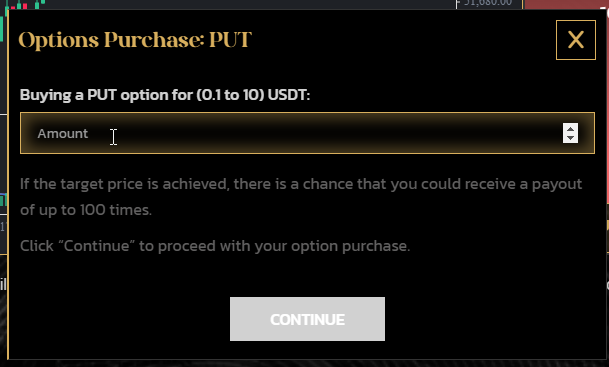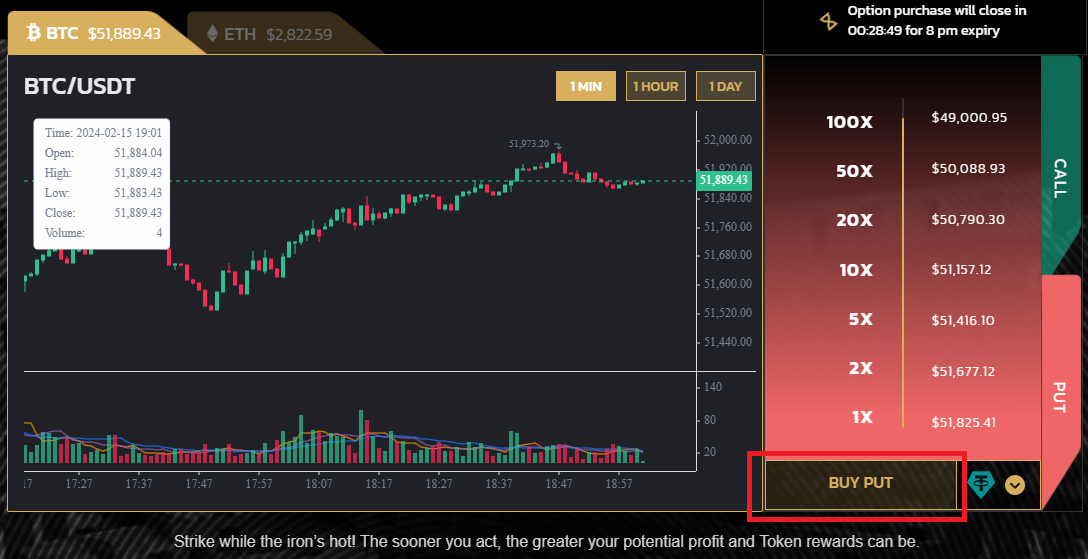 Watch the action This is where the excitement really begins. Observe the performance of your chosen cryptocurrency in real-time on a chart to see how the price is moving toward (or away from) its price ladder. You can exercise your options before the timer runs out to secure profits or cut losses or, you can let the timer run its course, resulting in the automatic expiration of the option. The choice is entirely yours – that's the beauty of American-style trading!