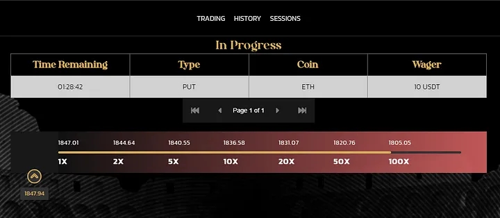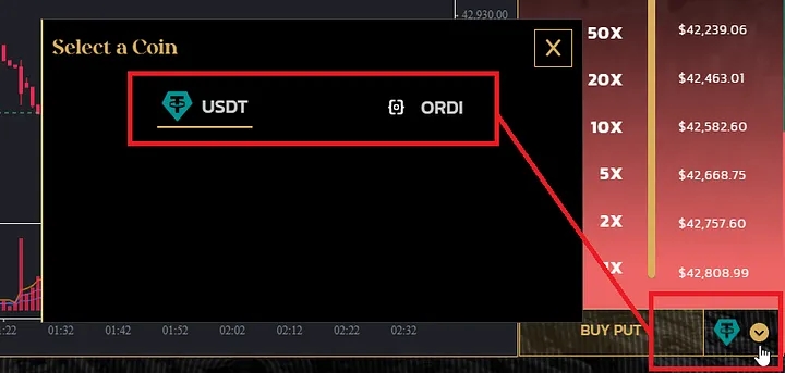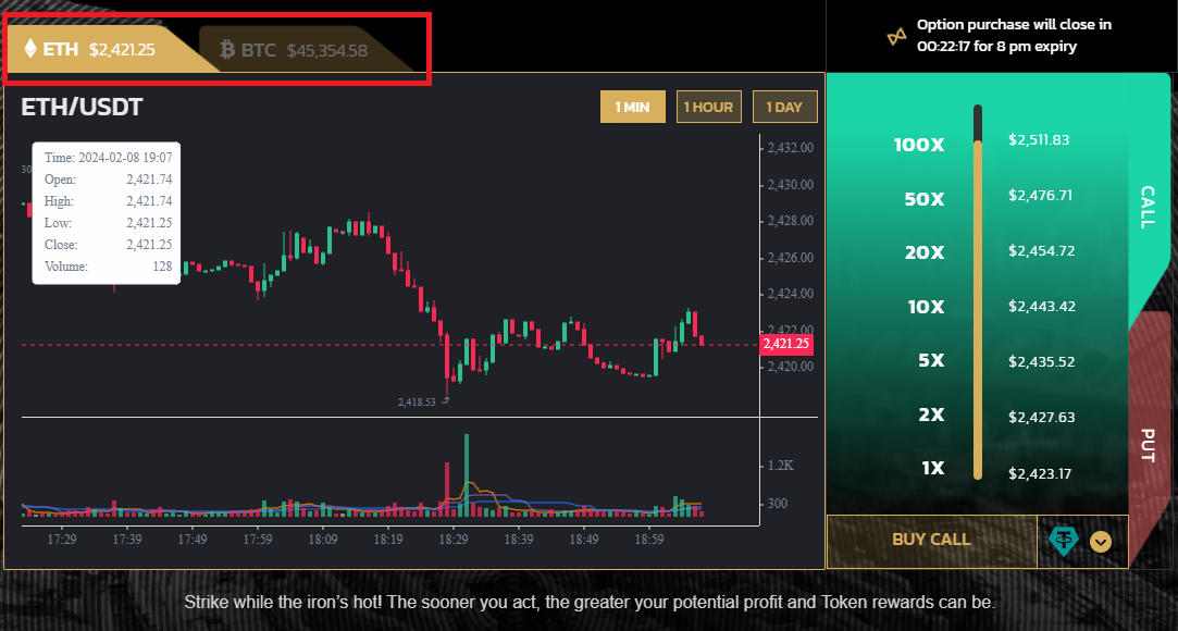 Choose the asset Currently, we offer ETH/USDT and BTC/USDT. Upon selecting the asset, you’ll be presented with a live price chart of the chosen pair.