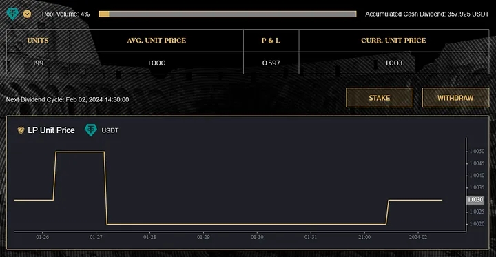 Shares within the liquidity pool are denoted as LP Units. These units are assigned a specific value during the pool’s initiation, and their subsequent prices are subject to fluctuations based on the profit and loss experienced throughout the pool’s operations.