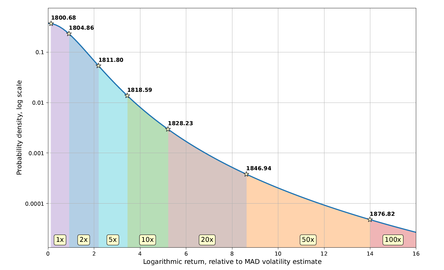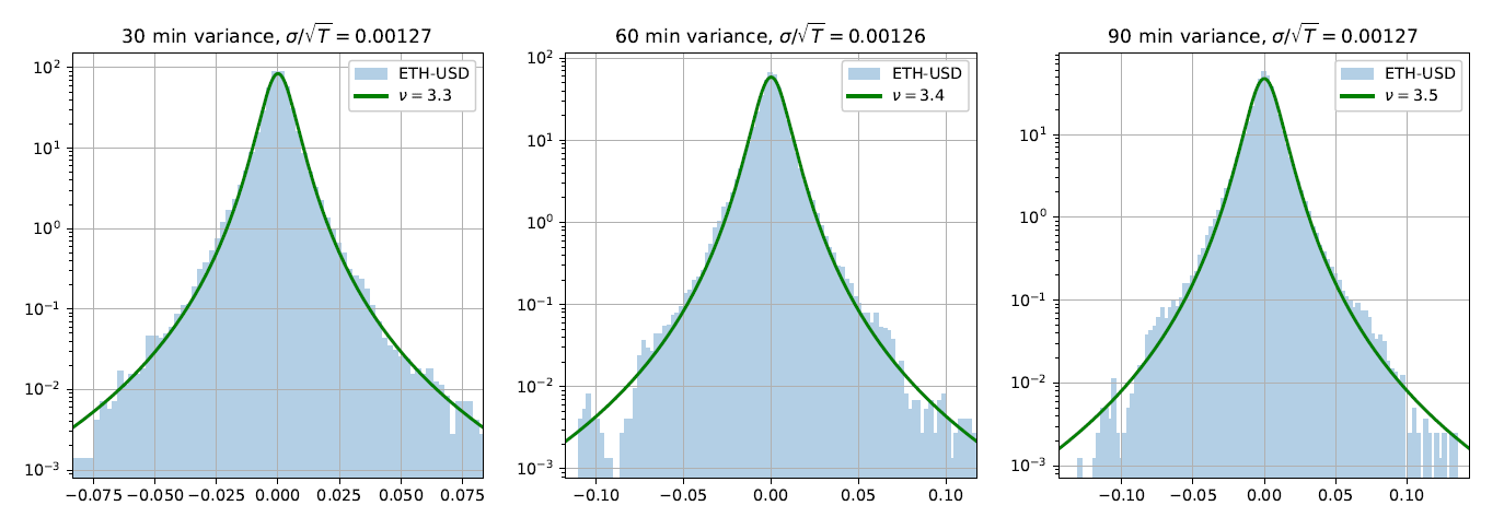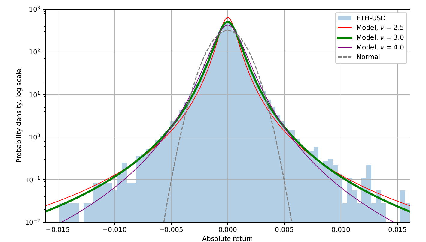 We were able to find a mathematical model that matches historical ETH/USD data pretty well. The model has two parameters, the scale which is equivalent to volatility for normal processes and dimensionality. The second parameter is expected to accommodate the changes in the distribution for periods longer than 1 minute.