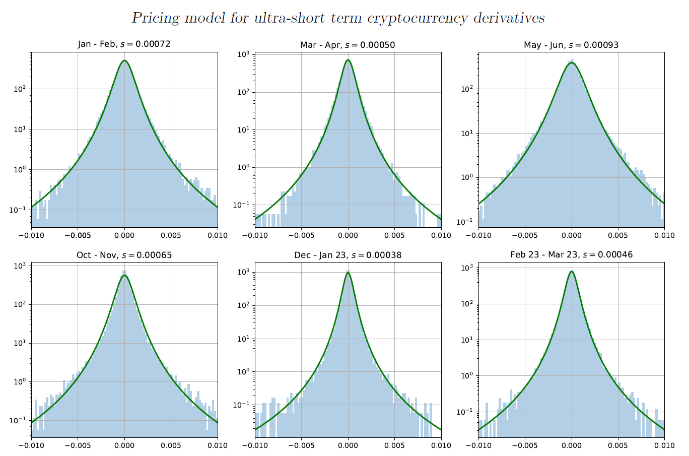 As can be seen from the charts on Fig. 2-4 the shape of the price fluctuation distribution is well approximated by our model, so it would be very easy to price derivatives post factum. To offer a practically usable pricing method, we need to find a way to predict the distribution scale for the upcoming period. Prediction of volatility is a common concern for all derivate pricing models, so there is a large body of research on the subject (a good overview can be found in Filipovic & Khalilzade, 2021). In general, those methods fall into two categories: those that only use price history data and those that include fundamental economic factors. In our case maturity periods are so short that it does not make sense to try to take into account fundamental factors. One notable exception would be the situation when the timing of the fundamental event is known in advance. For example, the amount of rewards Bitcoin miners receive for each transaction block is set to halve at predetermined intervals. Such an event will likely be awaited by the majority of traders anticipating the change in the Bitcoin value and looking forward to trading in this opportunity. This increased trading activity is likely to suddenly increase volatility not only of Bitcoin but many other cryptocurrencies as well. Even common market events, such as the Federal Reserve's decision on the prime rate can have a ripple effect on cryptocurrency.