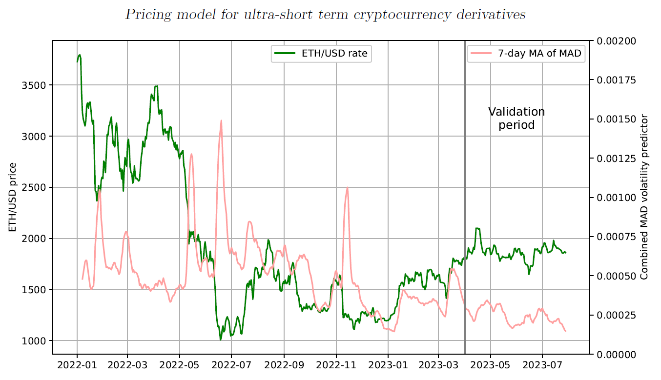The analysis was done on a 1-minute OHLC (open-high-low-close) ETH/USD price data obtained from the Coinbase cryptocurrency exchange. The data covers the period from Jan 1, 2022, to September 1, 2023. The period from January 1, 2022, to March 31, 2023 (15 months) has been used for the analysis and development of the pricing model. The remaining data from April 1, 2023, to September 1, 2023 (4 months) has been used for validation of model performance.