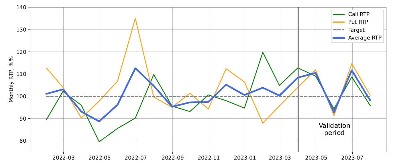 Simulation result: CallRTP = 101.9%, PutRTP = 104.4%, or 103.15% on average. The breakdown by month is shown in Figure 13. The first thing that catches attention is that call and put performance is now very close and they deviate together from the expected RTP value. This should be expected, given that the price of ETH barely changed during that period, and there were no significant trends up or down. The overall RTP is almost 3% higher than what was observed during model development. While it could be the result of a lower number of trades during the validation period leading to higher variance, we will need to investigate whether there is any systemic factor at play. One avenue for further analysis is to explore how the volatility predictor works in a low-volatility environment.
