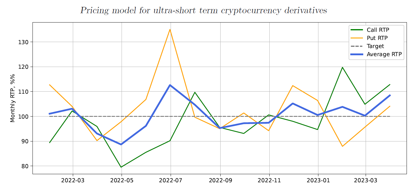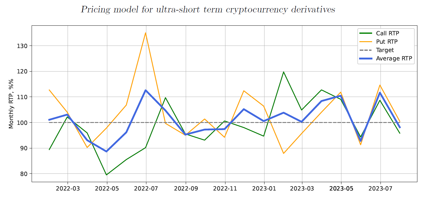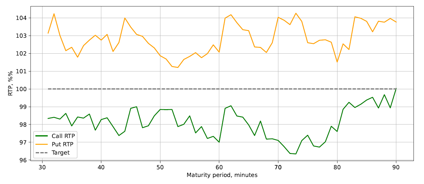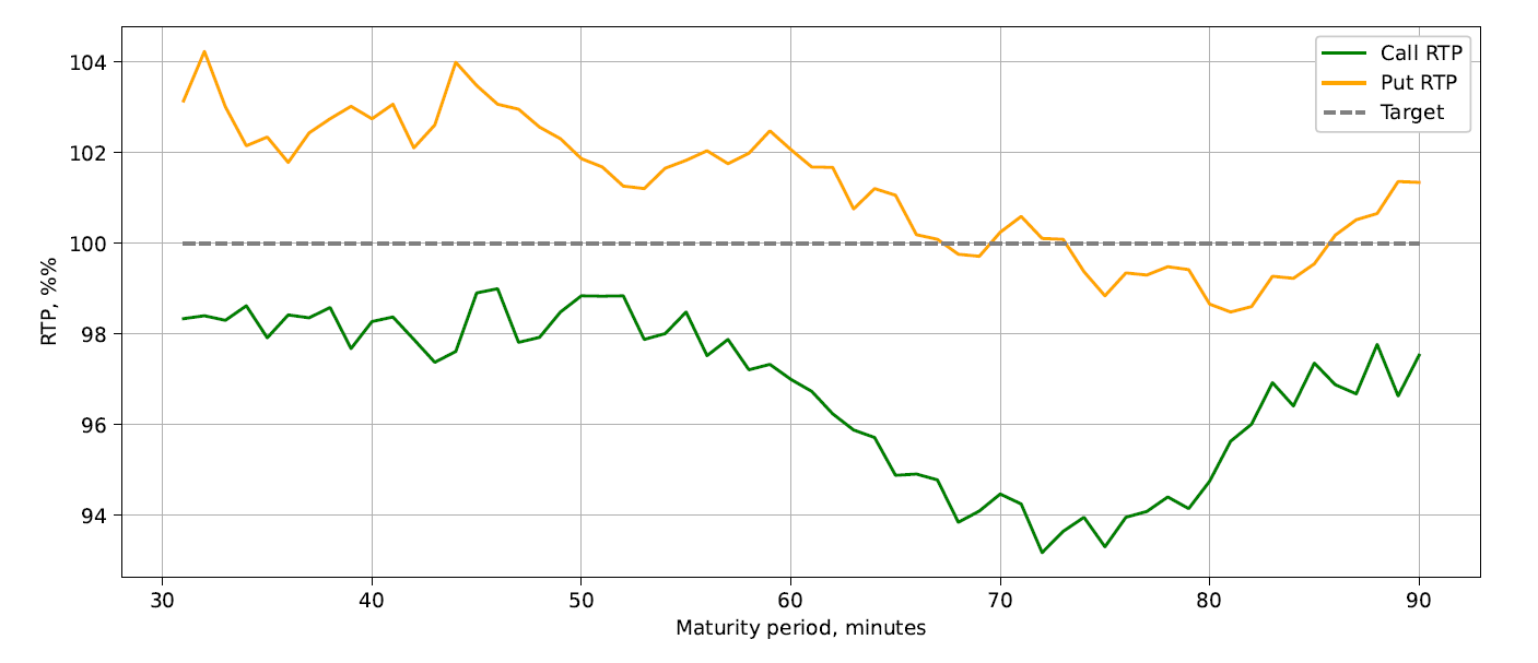 The initial results of the simulation on the 15-month testing period (Jan 1, 2022, to September 1, 2023) yielded reasonable overall results, as shown in Figure 9. At the same time, the breakdown of RTP by maturity time showed that it is not uniform, with transactions initiated 70-80 minutes to maturity having noticeably lower RTP (Figure 10).