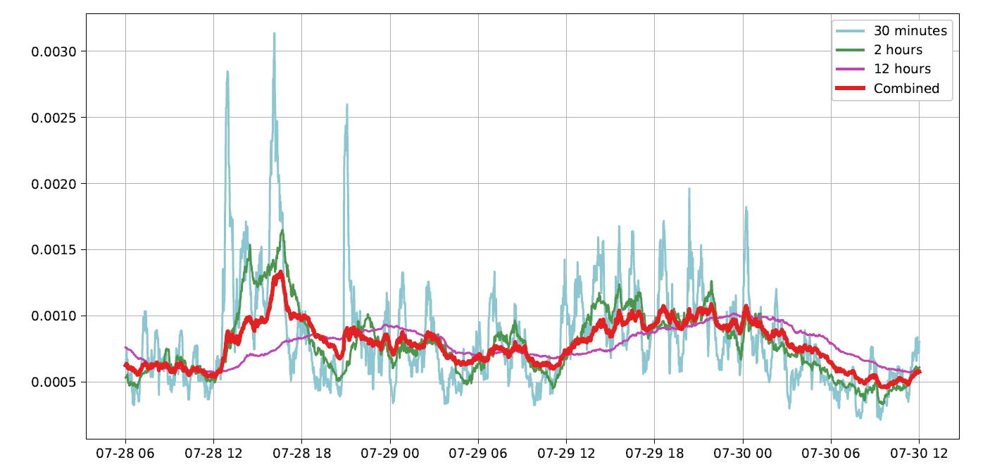 We found it necessary to combine the metrics calculated over multiple periods because short-period metrics, such as preceding 30 minutes, have a lot of variance in them that in most cases does not correspond to material changes in market conditions, but when such change does take place, they respond quickly to it. Metrics calculated over longer periods are more stable, but too slow to respond to the changes in market conditions. To obtain an estimate that is both reasonably stable and responsive, we use a linear combination of the estimates from multiple periods.